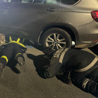 Der vermeintlich „kleine“ Einsatz gestaltete sich schließlich wesentlich schwieriger als angenommen, weil das Kätzchen zwischen diversen Kunststoff-Abdeckungen und der Antriebswelle des rechte Vorderrades maximal feststeckte. Alle Versuche den „maunzenden Vierbeiner“ von der Motorraumseite aber auch von der Seite der Bodenplatte zu befreien, scheiterten. „Blacky“ hatte sich den kleinsten Zwischenraum „ausgesucht“ und konnte sich weder selbst noch mit Hilfe unserer Kameraden befreien. Als dann – nach Absprache des KFZ Besitzers (der auch gleichzeitig seine eigene, seit gestern abgängige Katze nun wieder gefunden hatte) – das Vorderrad, diverse Anbauteile im Motorraum und mehrere Abdeckungen / Verkleidungen demontiert waren, konnten wir mit Mühe und Vorsicht das kleine Kätzchen befreien und dem Besitzer übergeben. Mit einem anderen KFZ machte man sich auf den Weg zum Tierarzt und wir montierten inzwischen wieder die abgebauten Teile am Fahrzeug des Katzenhalters. Nachdem wir nach 90Minuten Einsatzdauer ins Feuerwehrhaus eingerückt waren erreichte uns die Meldung „Blacky geht es den Umständen entsprechend gut, nicht gebrochen, und die Verbrennungen werden wieder heilen – Vielen Dank für die Hilfe der Feuerwehr“. Unser Dank gilt an dieser Stelle besonders MECHANIKERMEISTER DIETER EKKER – Dieter war nach einem Anruf sofort bereit uns hier mit „KnowHow, Körpereinsatz und technischem Equipment“ zur Seite zu stehen. Danke Dieter – mit Deiner Hilfe konnten wir diesen Einsatz positiv abwickeln. © SJF